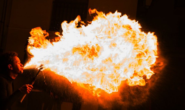 Impresionante espectáculo itinerante con espectaculares paradas en el recorrido acordado. Especialistas en el manejo del fuego que con sus movimientos coreográficos con la llamativa banda de percusión con sus irresistibles ritmos. Todo ello dejara al público boca abierto con una experiencia inolvidable. Acrobacias, malabares con fuego, faquir lanza fuegos, zancudos. Expertos manipuladores de objetos en llamas, que con toda seguridad lograran el disfrute de grandes y pequeños. (Espectáculo sin pólvora)