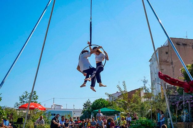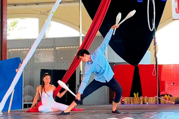 Percusión en directo, clown, malabares, acrobacias sobre los zancos, bicis de una rueda, equilibrios… de los artistas consigue el disfrute de grandes y pequeños. Todo esto se mezcla con una sencilla y al mismo tiempo divertida dramaturgia, que hace de este espectáculo en sus dos versiones itinerante y escenario o plaza, una divertida marea de circo que nos transporta por el mundo de la fantasía.